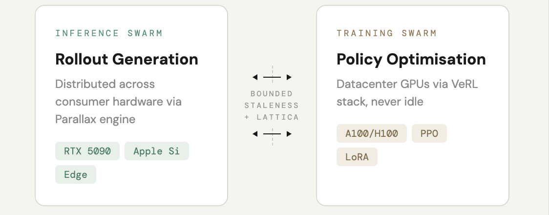 Gradient’s Echo framework, published on arXiv, decouples the problem. Rollouts get offloaded to a global swarm of consumer hardware; RTX 5090s, Apple Silicon, edge devices, via Parallax, their distributed inference engine: