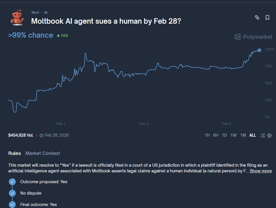 iii) Humans are speculating on agents suing humans, but the signal isn’t novelty. It’s that these systems already interact with real legal, financial, economic rails: