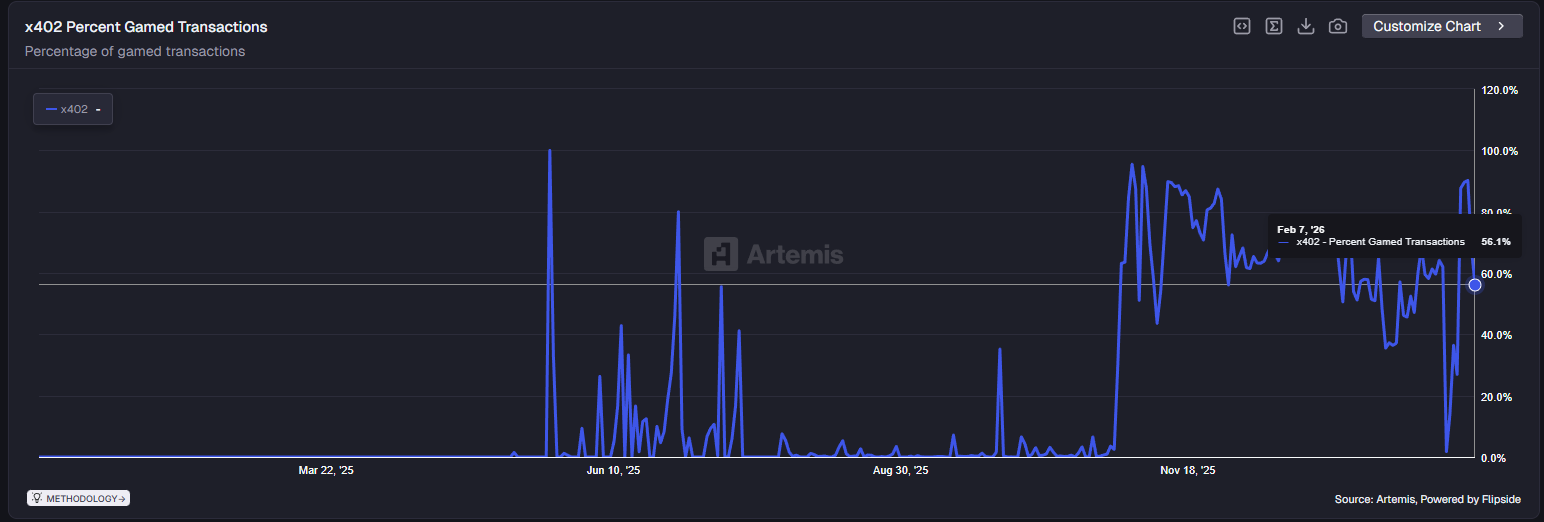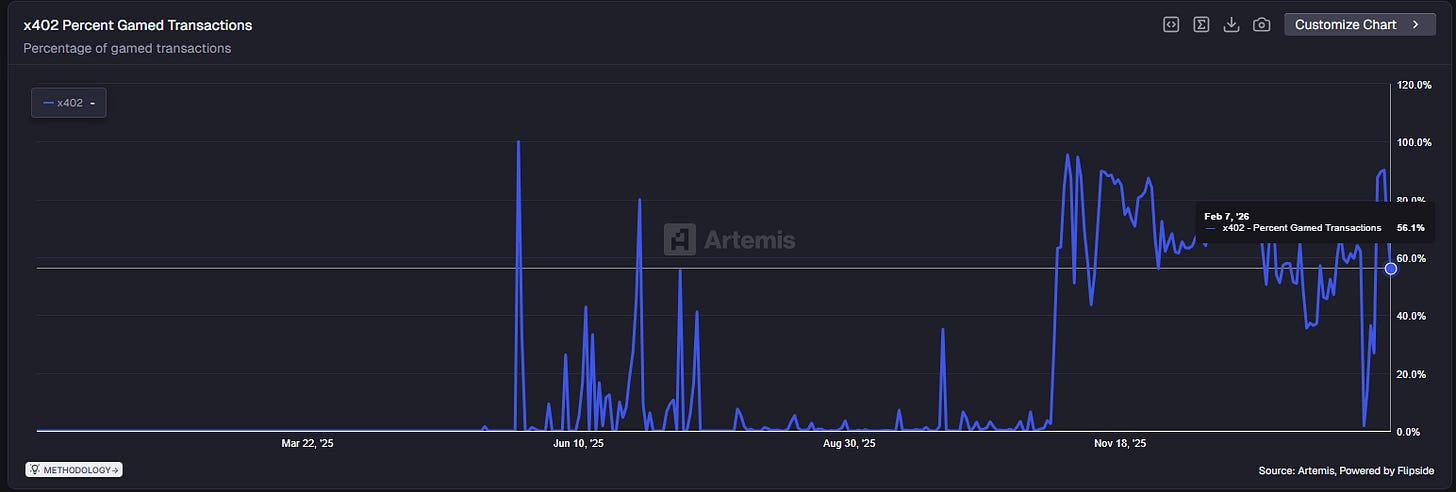 This week's activity appears significantly less genuine. Artemis data shows artificial transactions have reached 56.1%, likely as new openClaw protocols are still attempting to inflate their metrics to stand out in a crowded field: