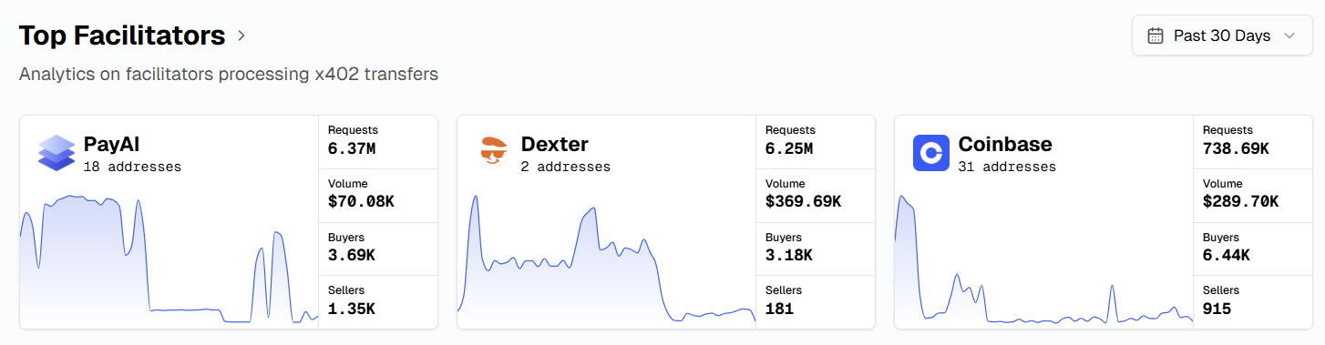 Coinbase, PayAI, and Dexter retain the top three facilitator spots, though PayAI’s 30-day requests fell to 6.37m from 8.39m last week: