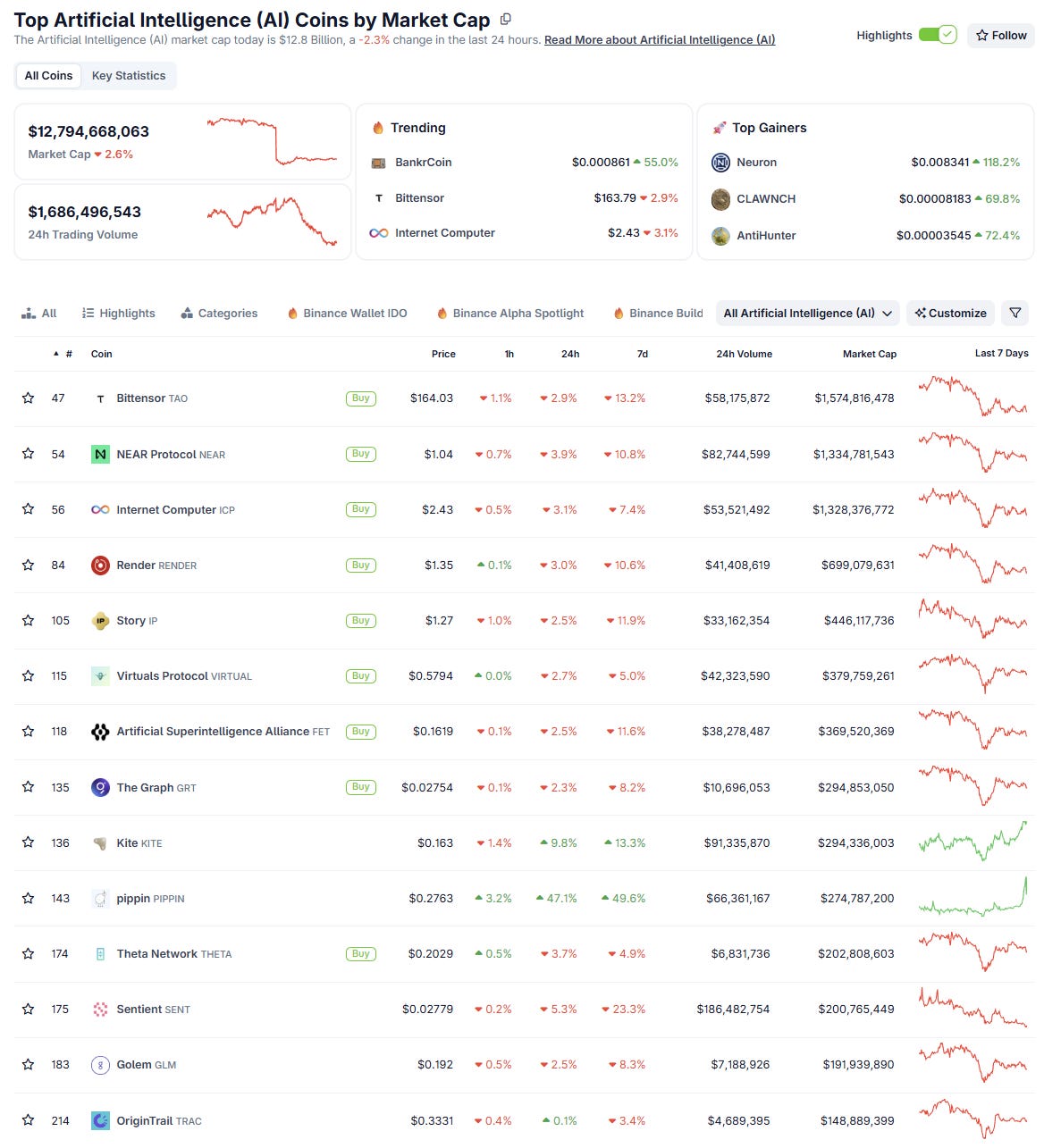 The overall DeAI market cap has declined by $8.9bn (-41%) to $12.8bn this week: