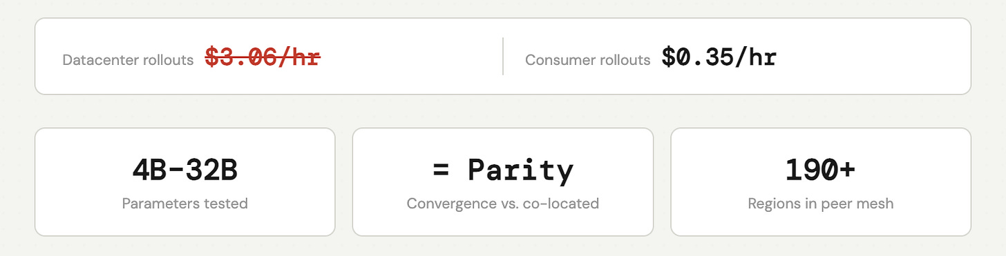 Training stays on datacenter GPUs where it belongs. Bounded staleness sync keeps the trainer running without waiting for stragglers, while Lattica handles Peer to Peer weight distribution at scale.