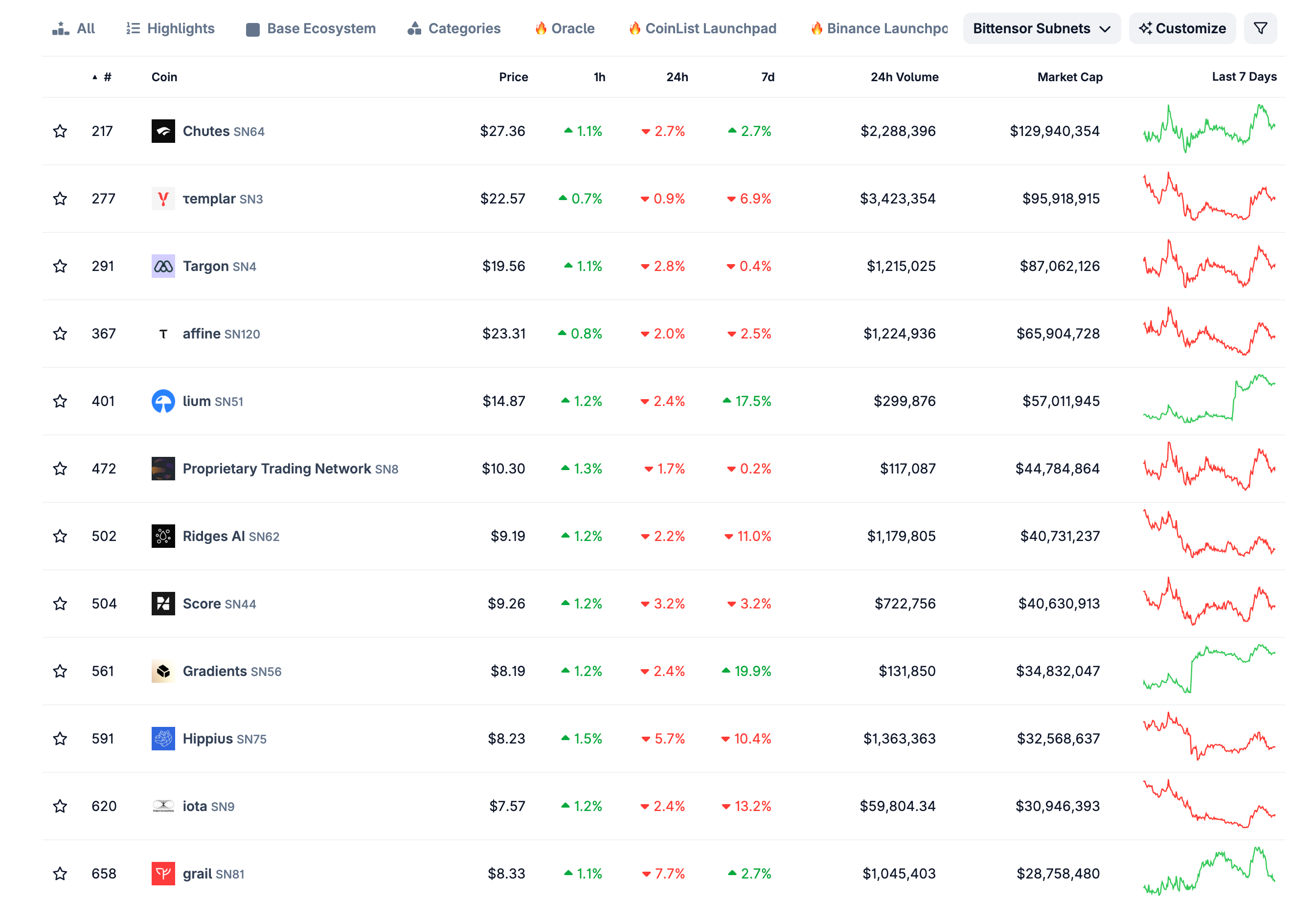 The Bittensor Subnets market cap has increased to $1.36B (+1.3% 7D):