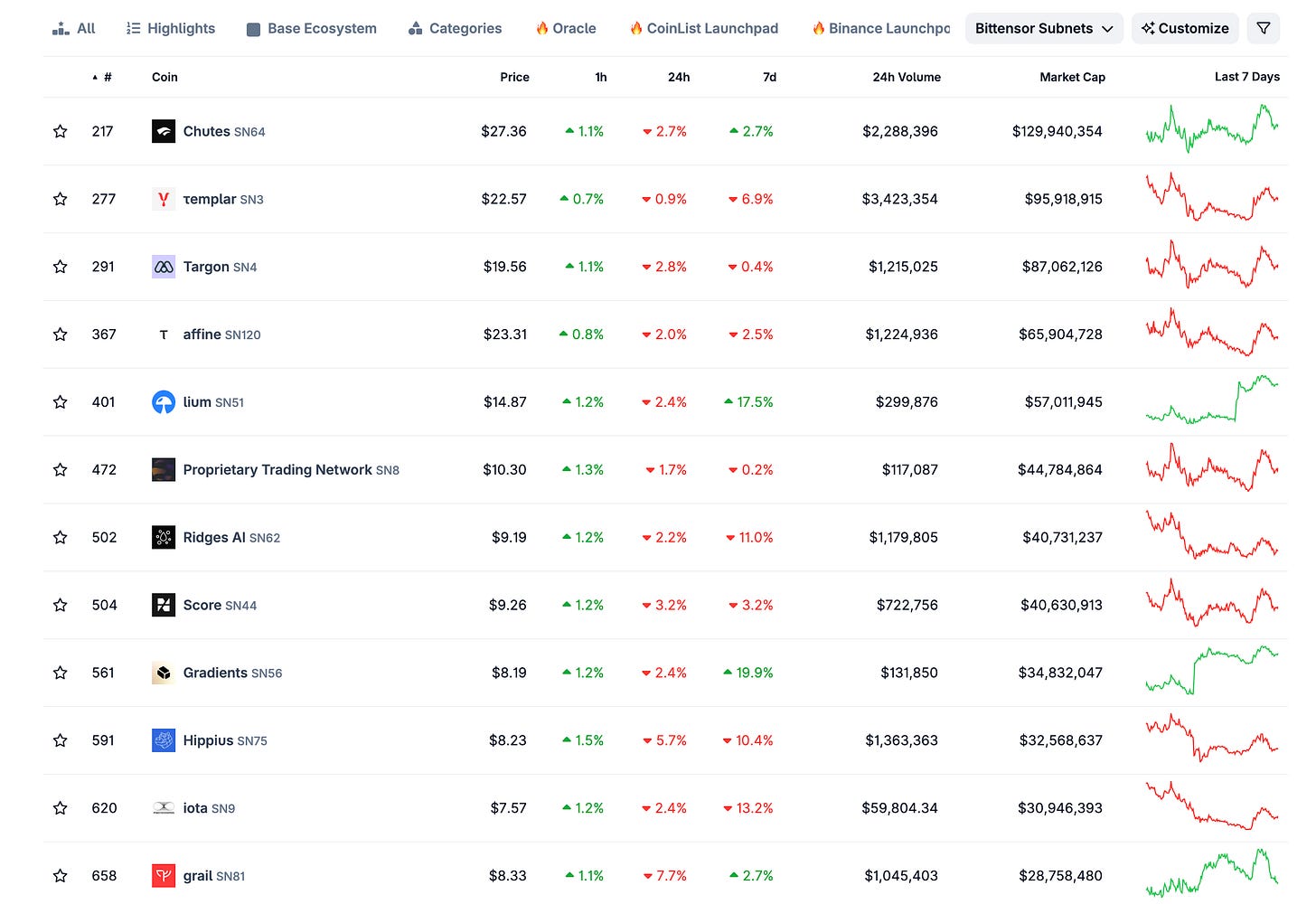 SN64 / Chutes remains the dominant SN at $129M mcap ($27.15, +1.6% 7d); strong revenue from inference with verification in Openrouter as it hits $10m ARR