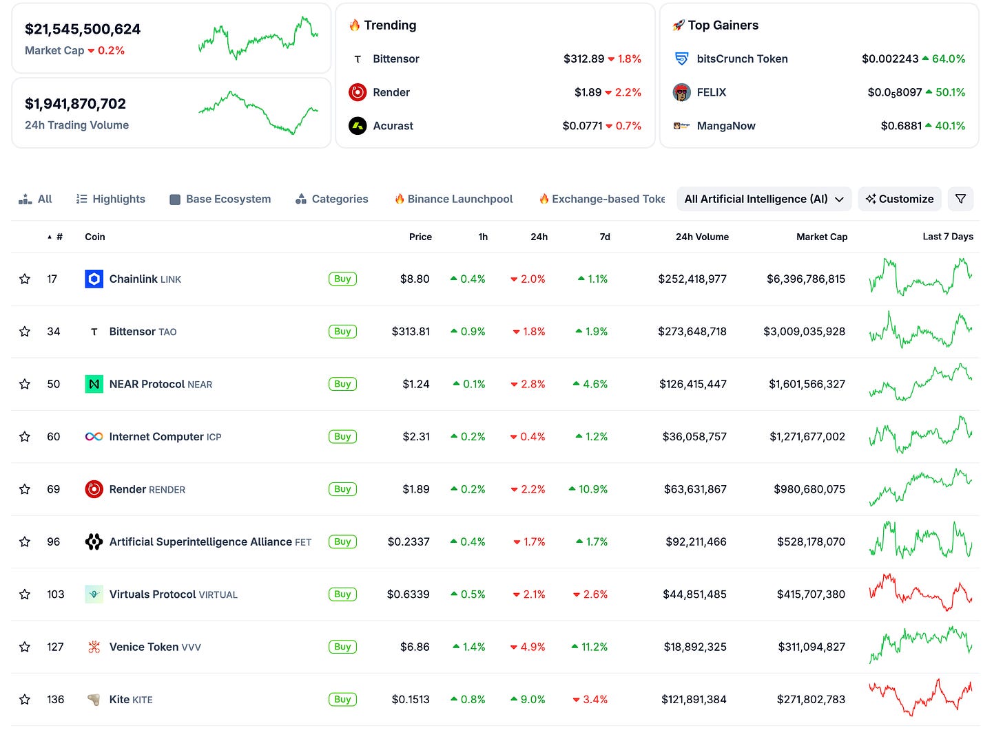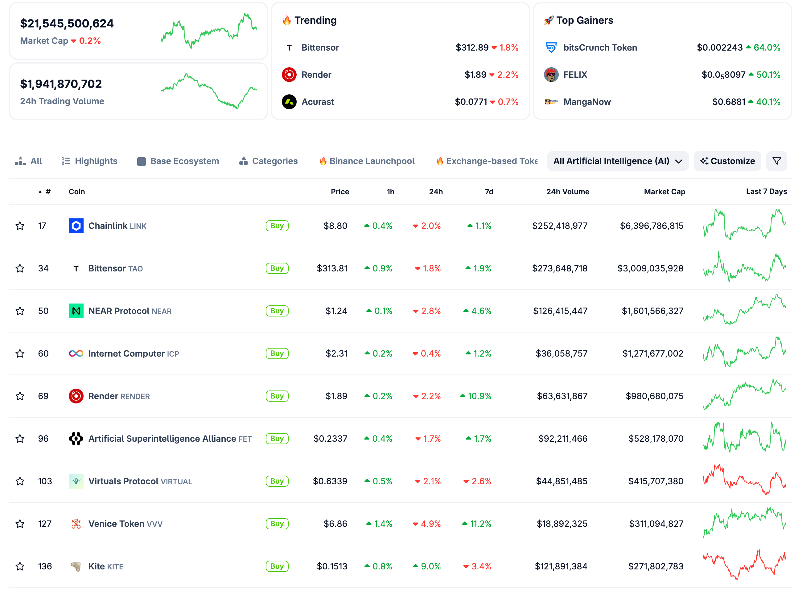 The overall DeAI market cap has decreased to $21.4B (-0.6% 7D):