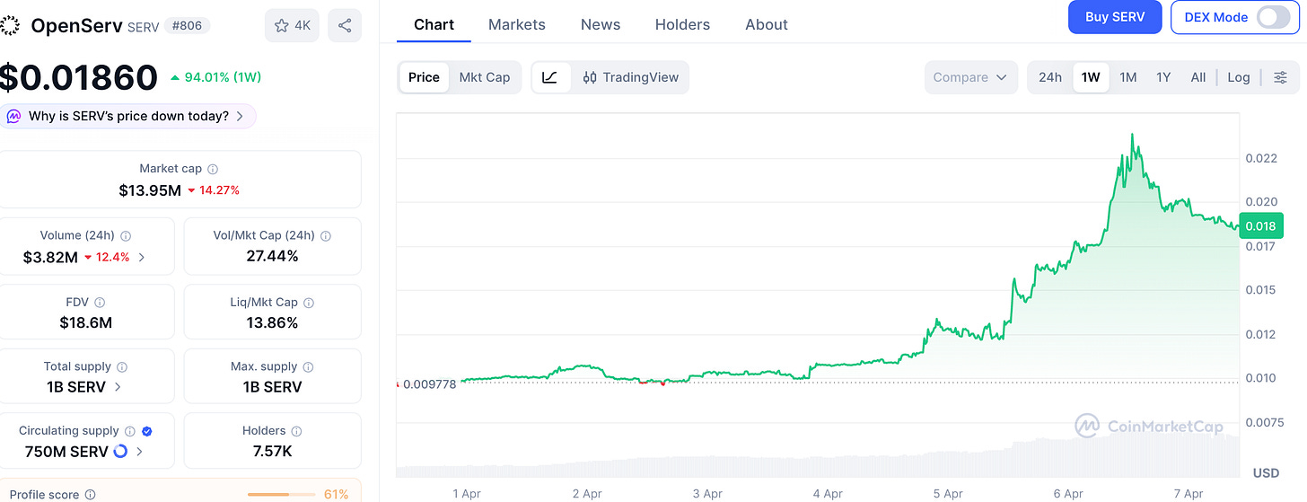 At ~$8-16M market cap (data varies by source), SERV remains one of the smallest tokens in the x402 ecosystem by capitalization.