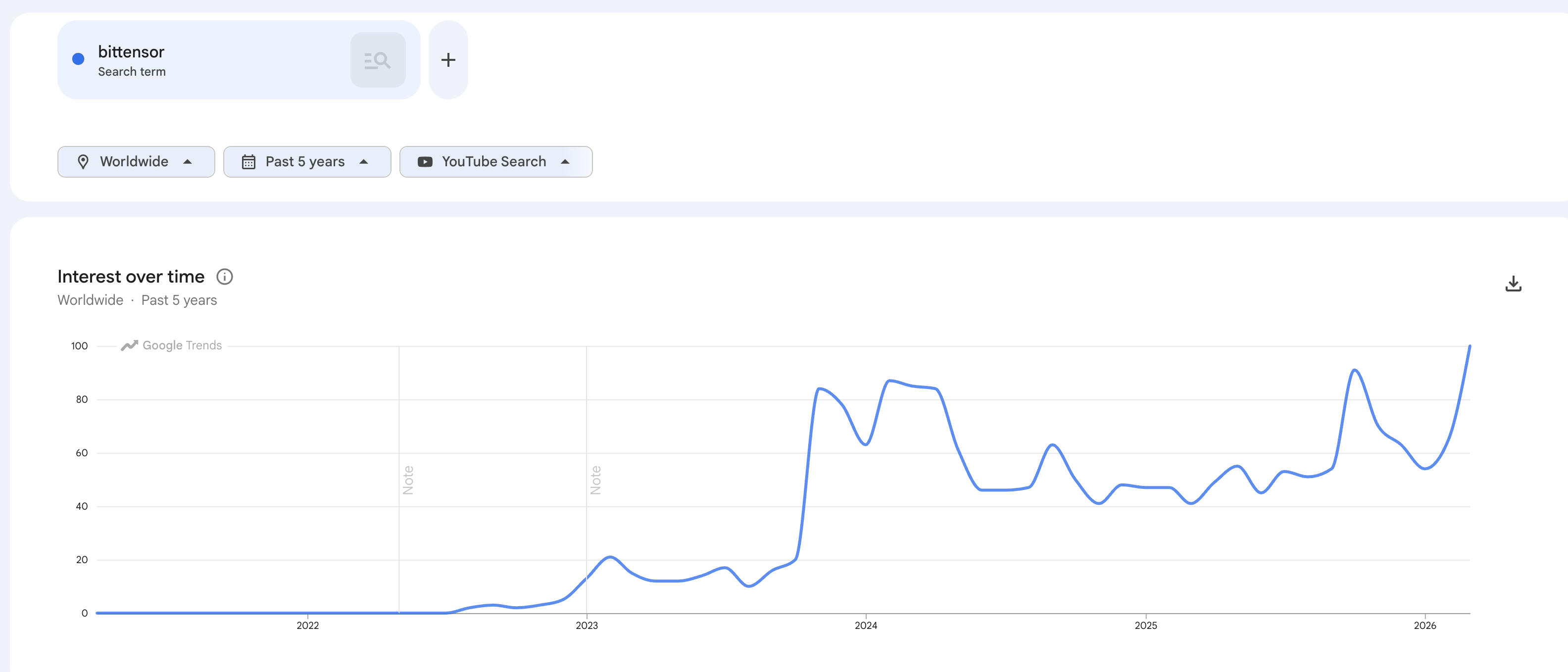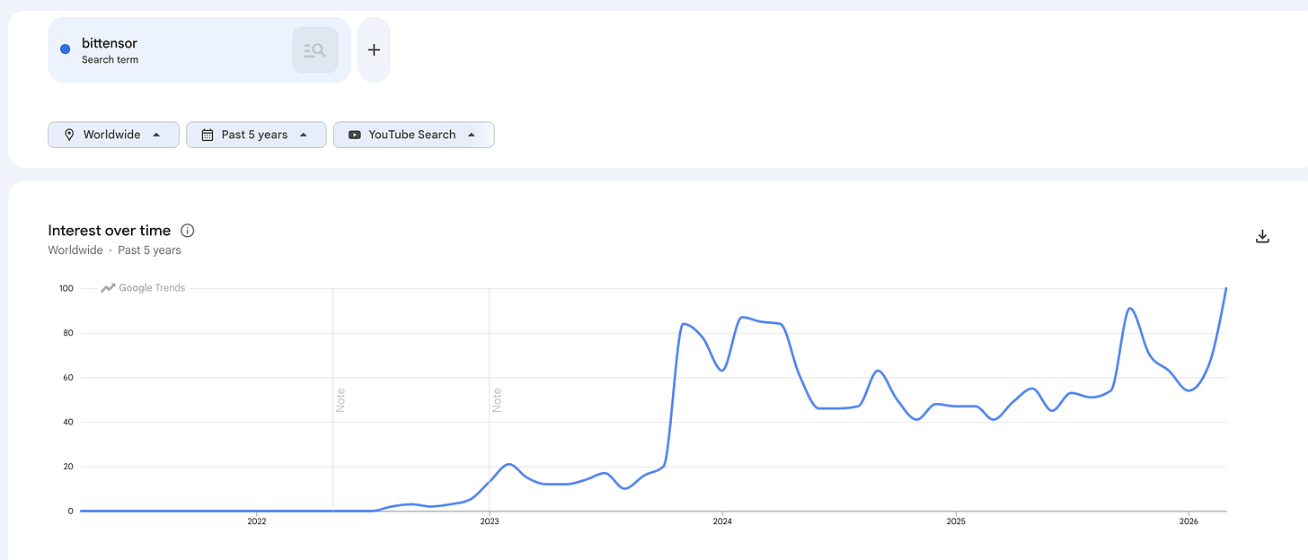 YouTube Search Trends for “Bittensor” just hit 100; the maximum possible score, representing peak search interest worldwide over the past five years: