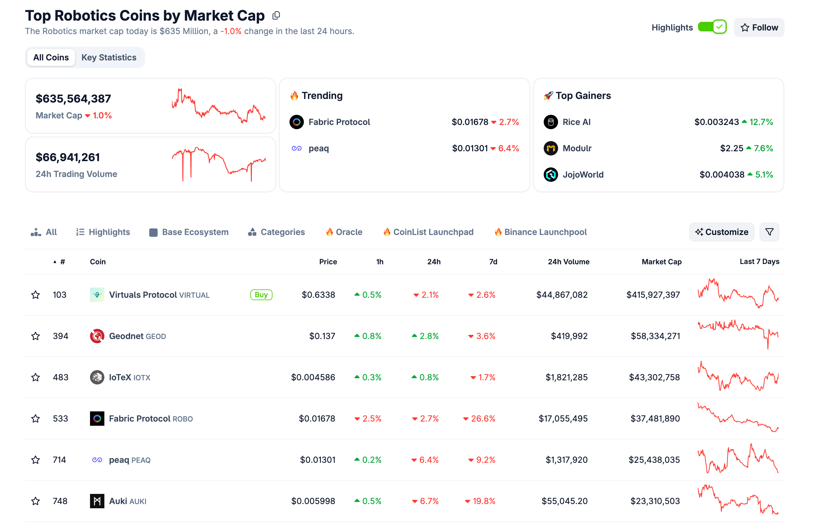 The robotics market cap has decreased to $632M (-1.4% 7D):