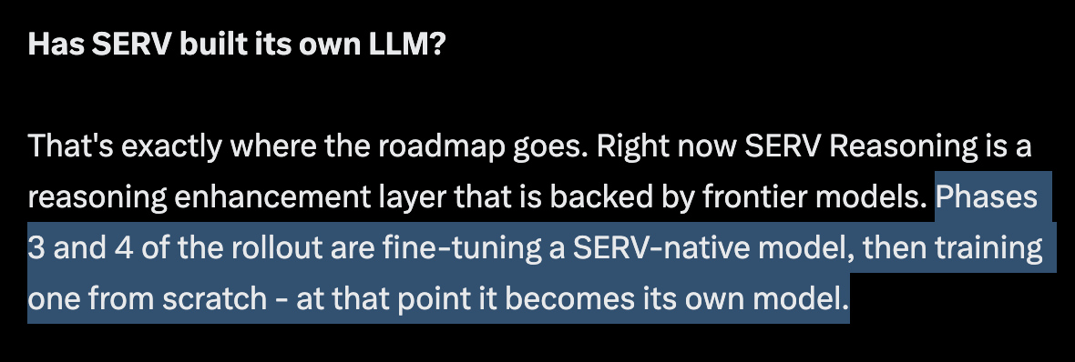 The team reports that SERV Reasoning is outperforming frontier models on specific benchmark comparisons, and the Neol partnership (UAE government and enterprise deployment) continues to provide real-world production validation.