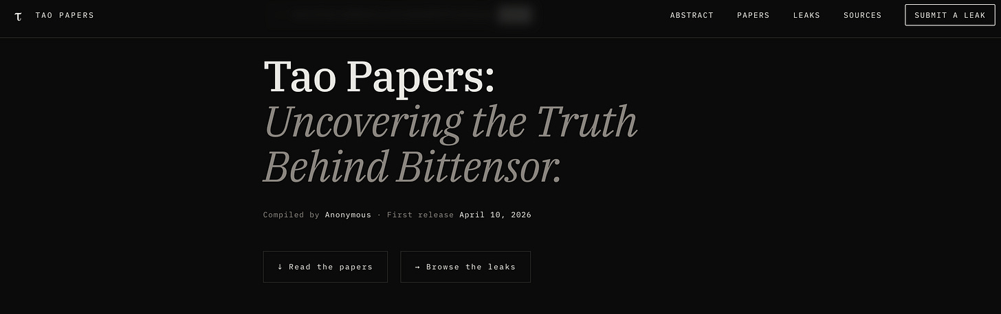 On the same day, a whistleblower site called Tao Papers went live, publishing internal documents, chat transcripts, and on-chain forensics from multiple sources inside the Bittensor ecosystem.