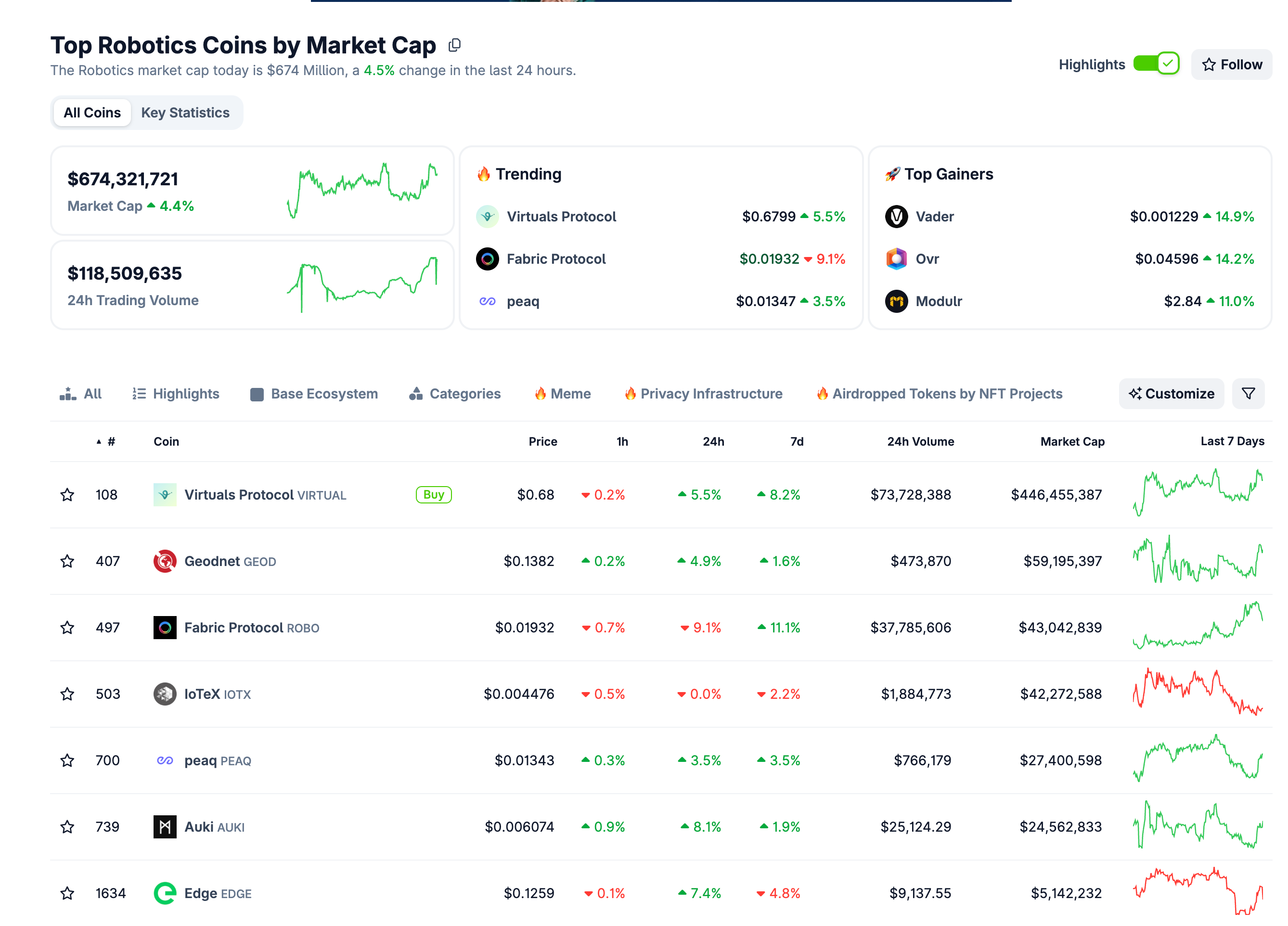 The Robotics market cap has increased to $674M (+4.4% 24h):