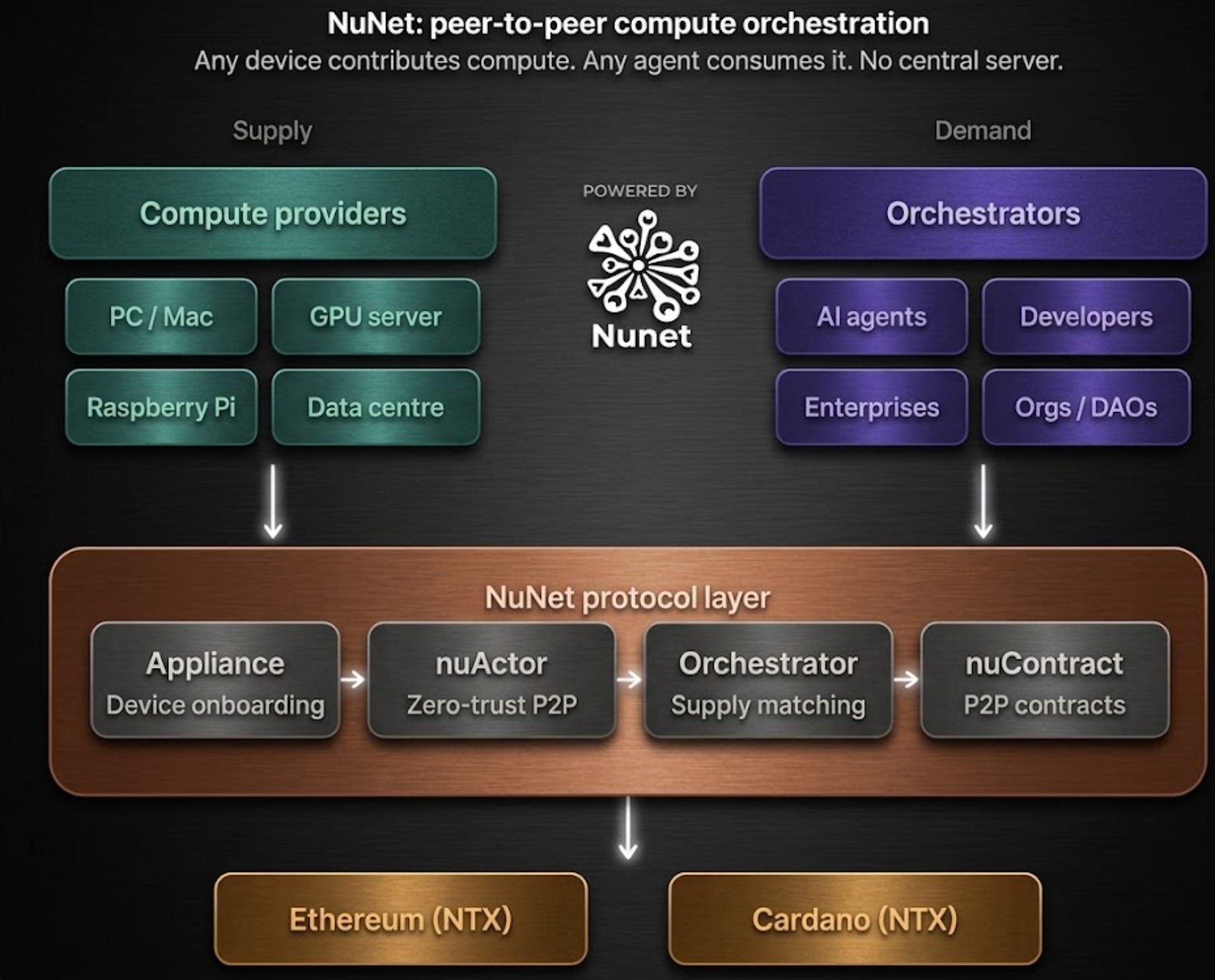 Multi-chain settlement: NTX transactions flow natively on both Ethereum and Cardano. Compute providers select their preferred chain when entering contracts. No bridges or wrapped tokens