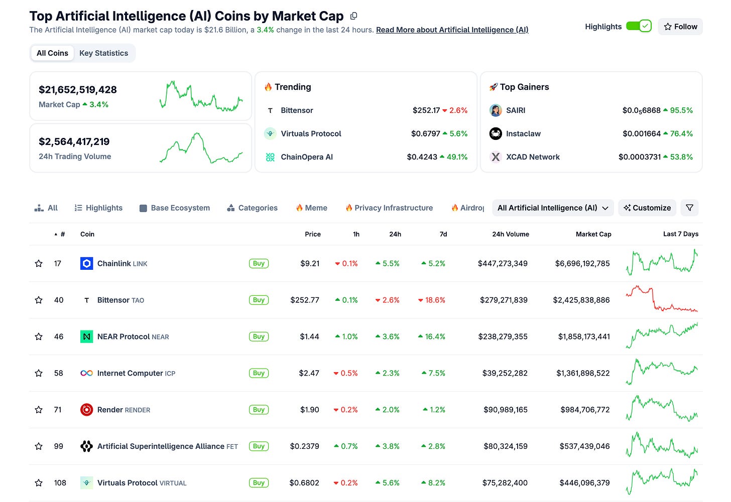 The overall DeAI market cap sits at $21.6B (+3.4% 24h):