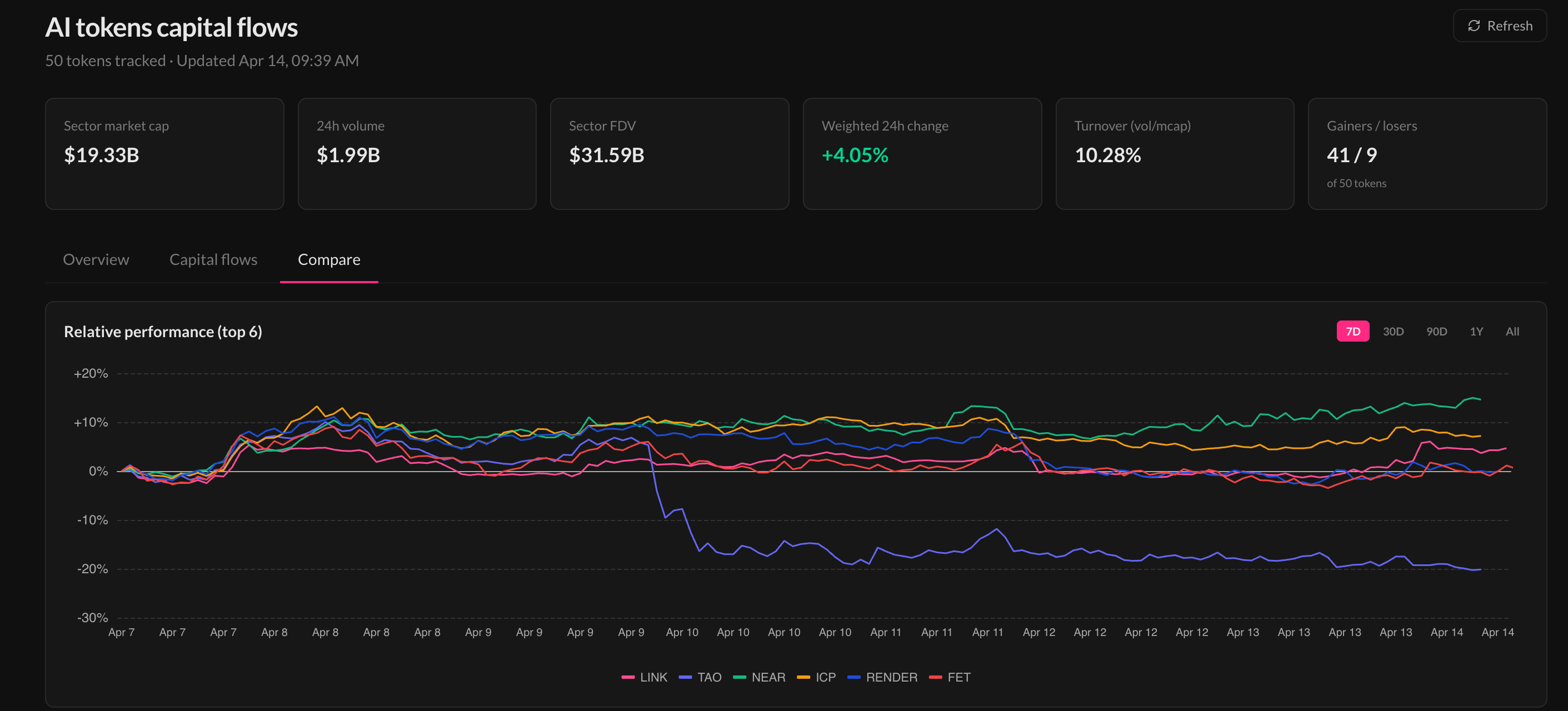 The 7D relative performance chart tells the story of the week in a single image. From April 7 through April 9, the top six AI large caps (LINK, TAO, NEAR, ICP, RENDER, FET) were clustered between 0% and +10%, moving in broad correlation