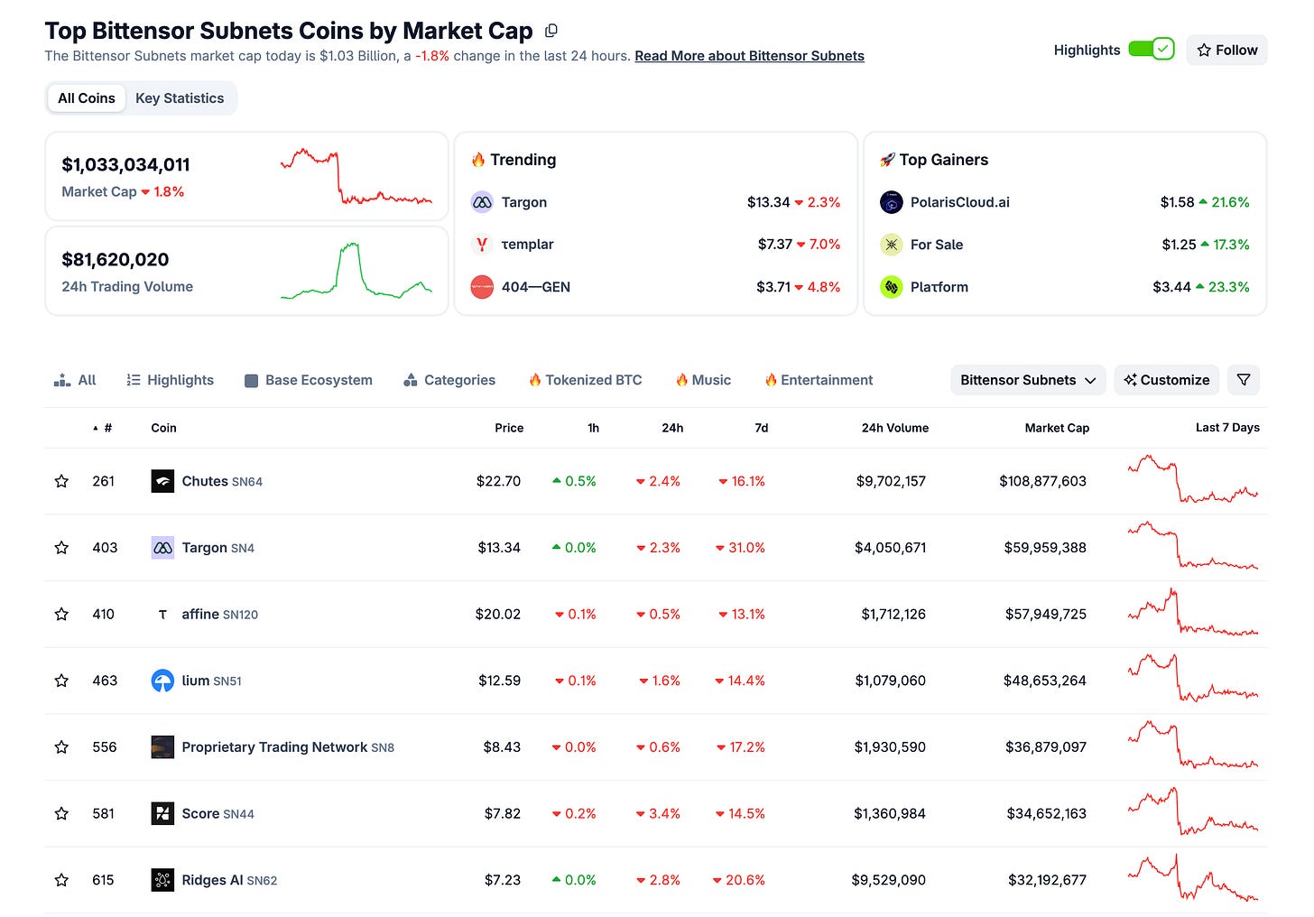 The Bittensor Subnets market cap has decreased to $1.03B (-1.8% 24h):