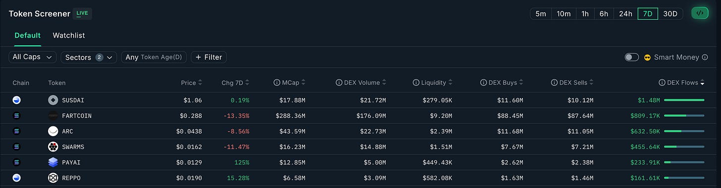 The virtuals eco sees inflows with PAYAI and REPPO doing $400k of combined inflows as agentic commerce continues to ramp up its activity with the new iteration (version 2) of x402. Coinbase highlights that x402 payments in the past 30 days have hit $50m with PayAI the second largest facilitator behind Coinbase: