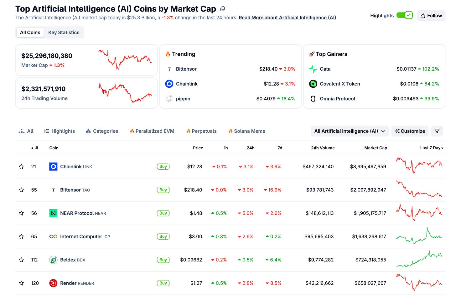 The overall DeAI market cap is down $1.6B (-6%) this week, consistent with the choppy broader crypto price action: