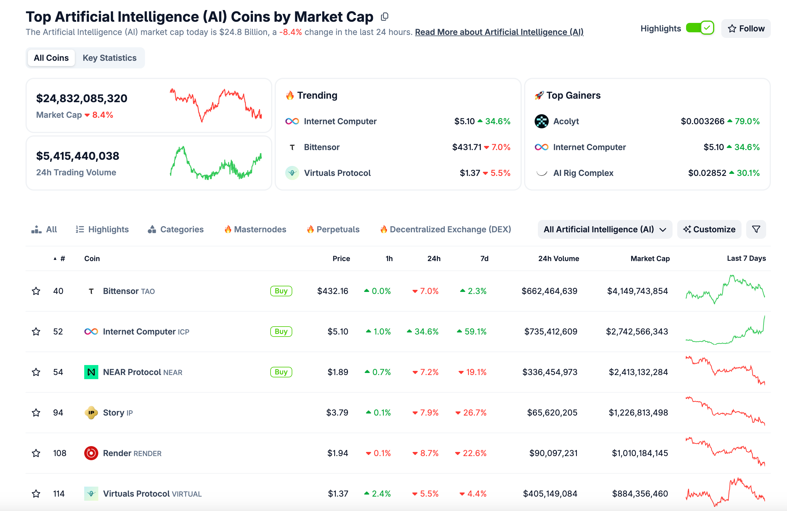 The overall DeAI market cap is down by $3bn (-11%) to $24.8bn: