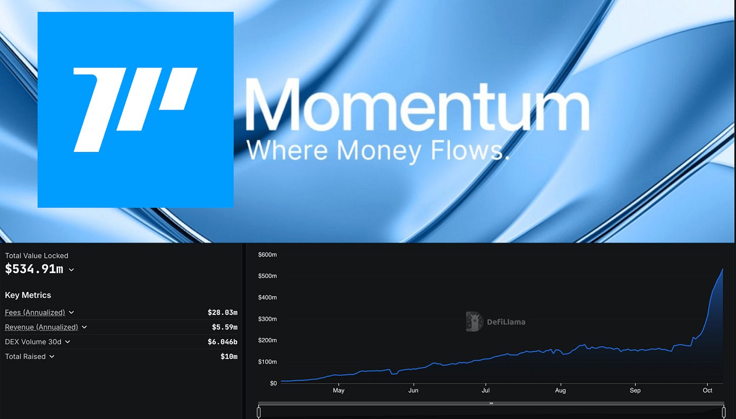 Momentum (MMT) dominates Sui as the #1 DEX with 62% market share, $534M+ TVL, and $15B+ in cumulative volume; the network’s core liquidity engine for stablecoin and BTCFi trading.