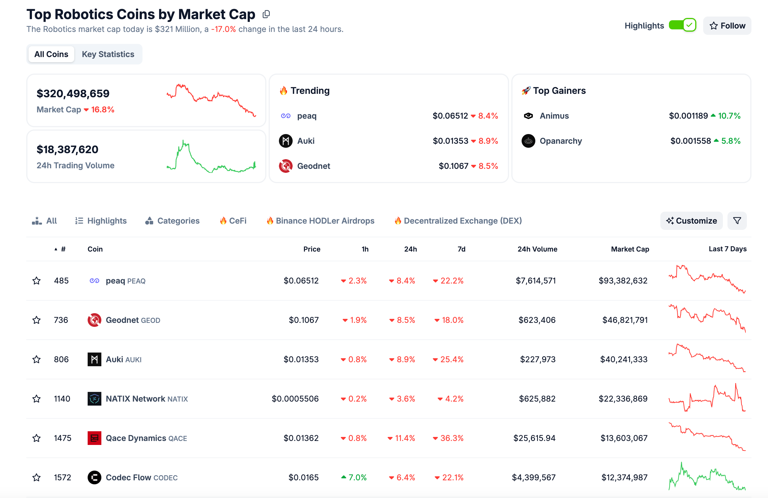 Most of the robotics projects followed the broader crypto market price action, with most down double digits.