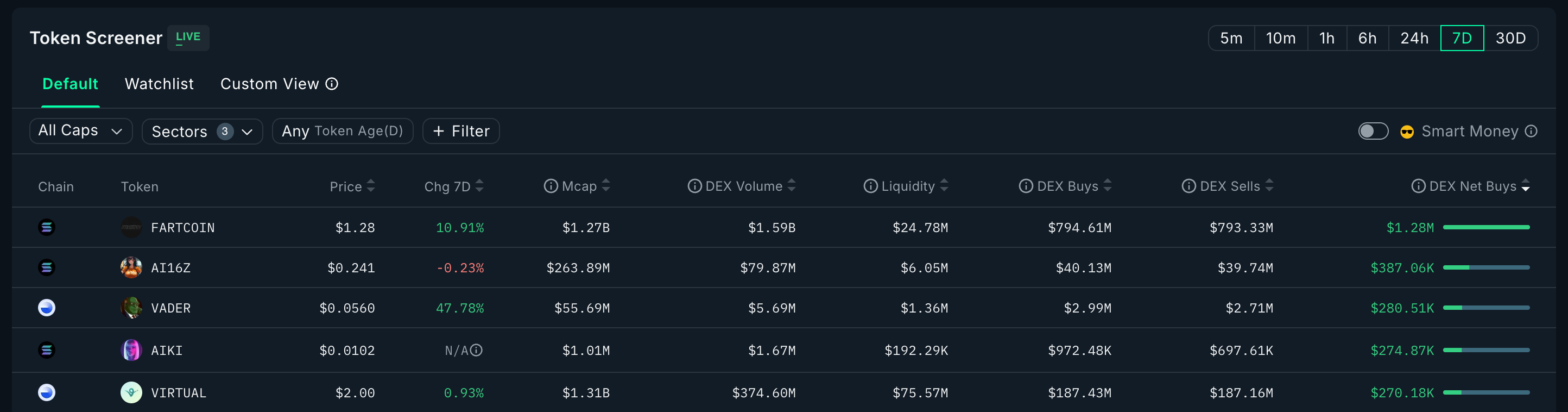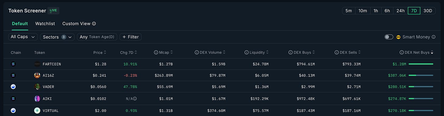 My personal favourite is the AI signals, portfolio tracking and capital flow analysis which contains filters such as AI Agent tagged protocols.