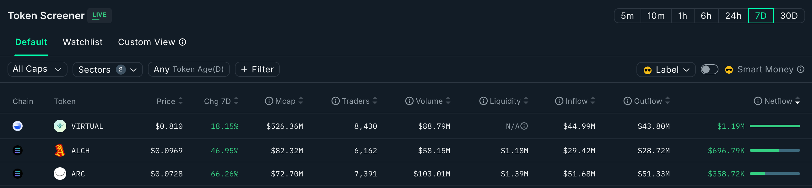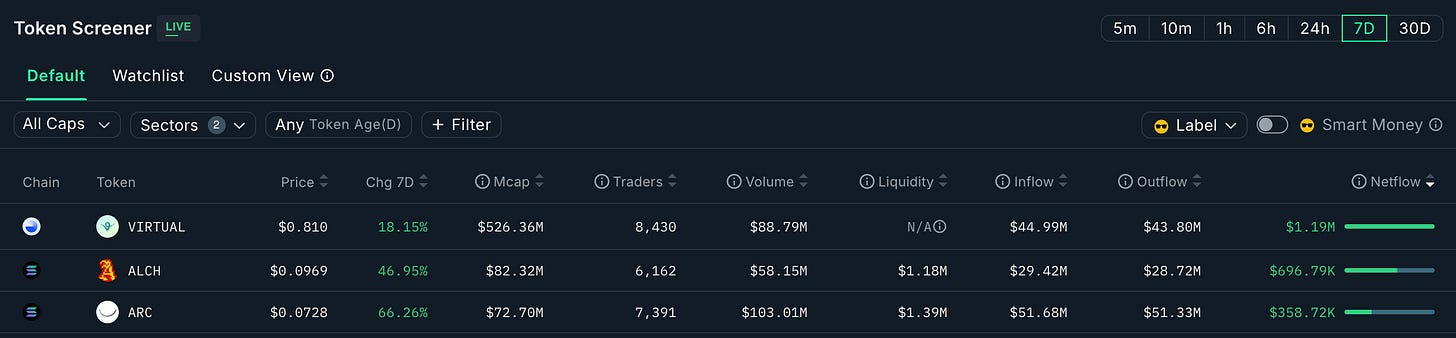 Virtuals leads the charge this week with > $1mm of inflows, followed by Alch and ARC who match it when combined:
