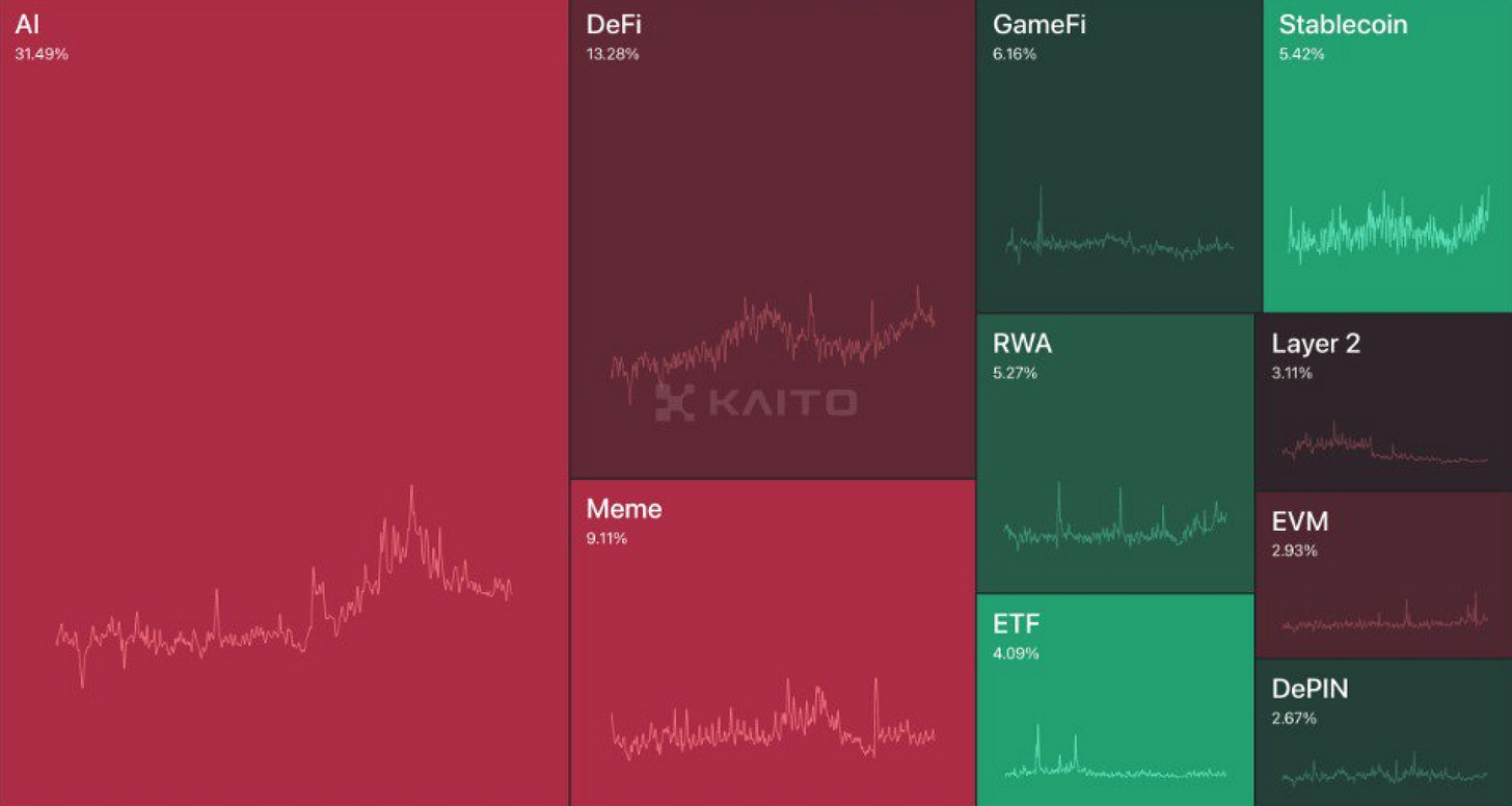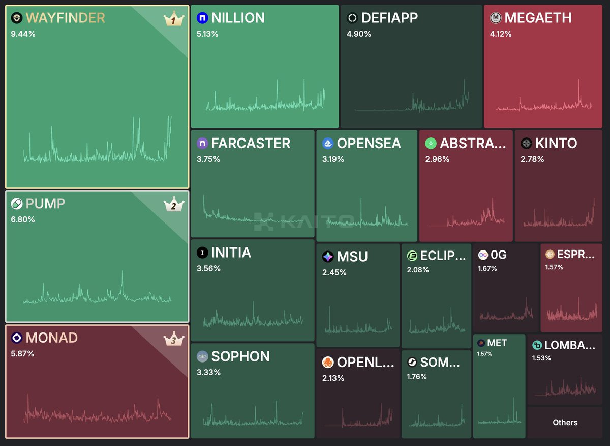 One that’s showing promise on the DeFAI front is Wayfinder. its pre-TGE mindshare continues to lead as the PROMPT TGE looms and Kaito Yapper leaderboard incentivizes creators: