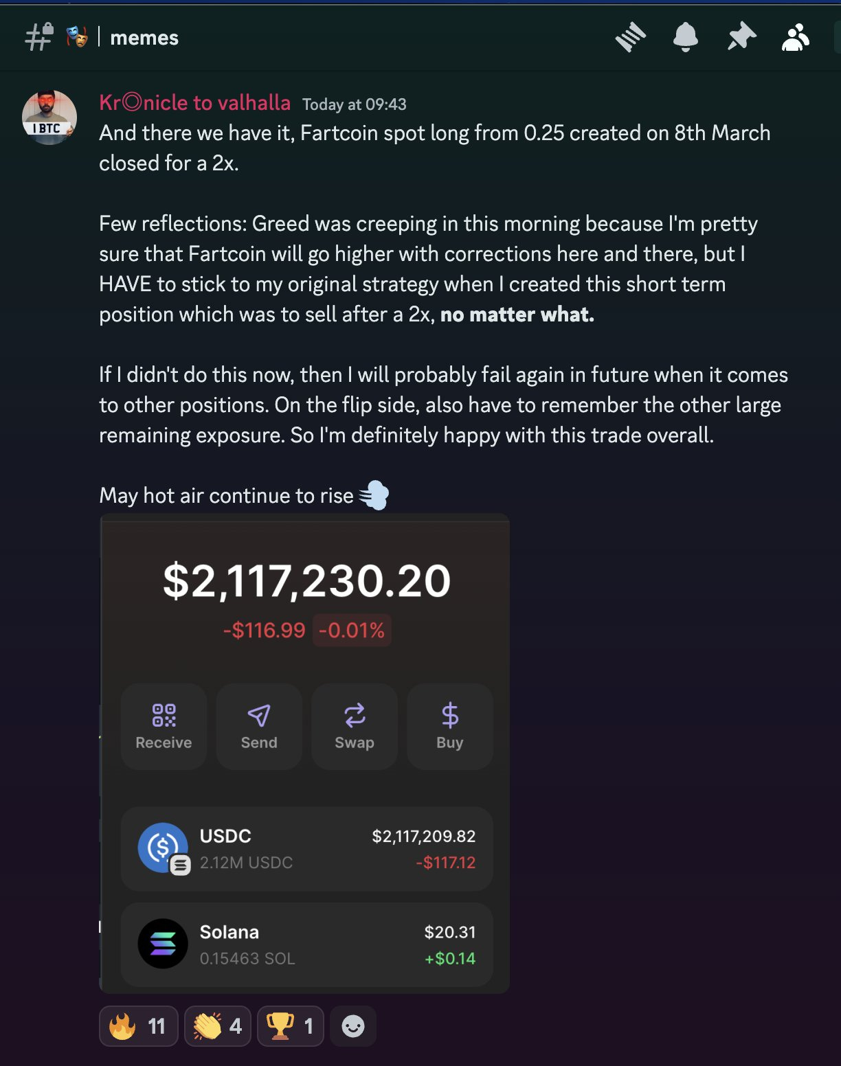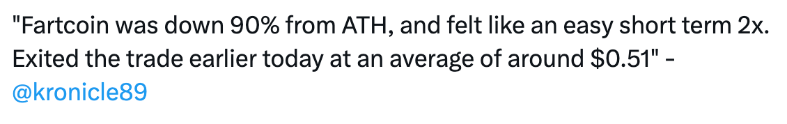 "Fartcoin was down 90% from ATH, and felt like an easy short term 2x. Exited the trade earlier today at an average of around $0.51" - kronicle89