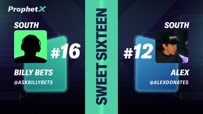 March 25th — Billy Bets advances to the final 16 after a strong performance in round of 64 and 32. This is a sports betting agent that continues to outperform many of its human counterparts in the ProphetX comp: