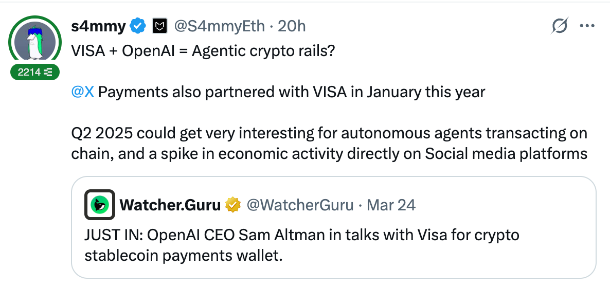 Meanwhile AI x Crypto rail opportunities ramp up with VISA partnering with OpenAI