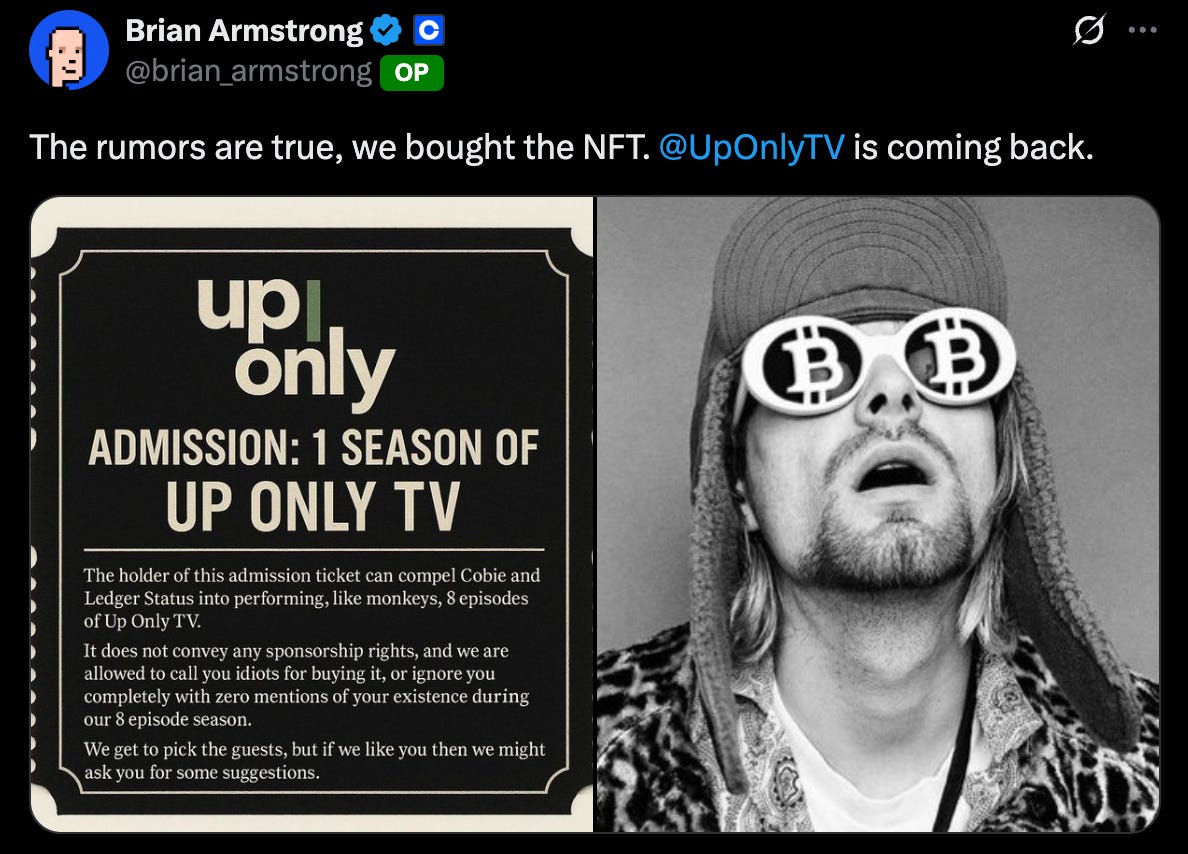 This week’s attention has turned to the whopping $25m Coinbase has spent on a crypto podcast “UpOnly”.