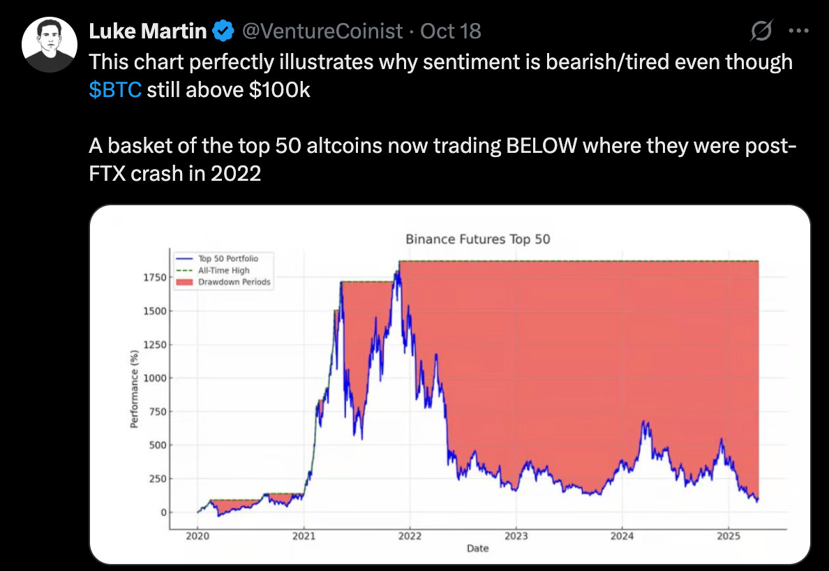 The market has held up reasonably well following last week’s flash crash; Bitcoin hovers above $105k while Ethereum is around $4k.