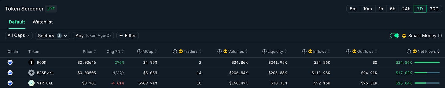 ROOM (Backroom) is the standout performer this week on smart capital inflows ($35k) and general inflows of $350k