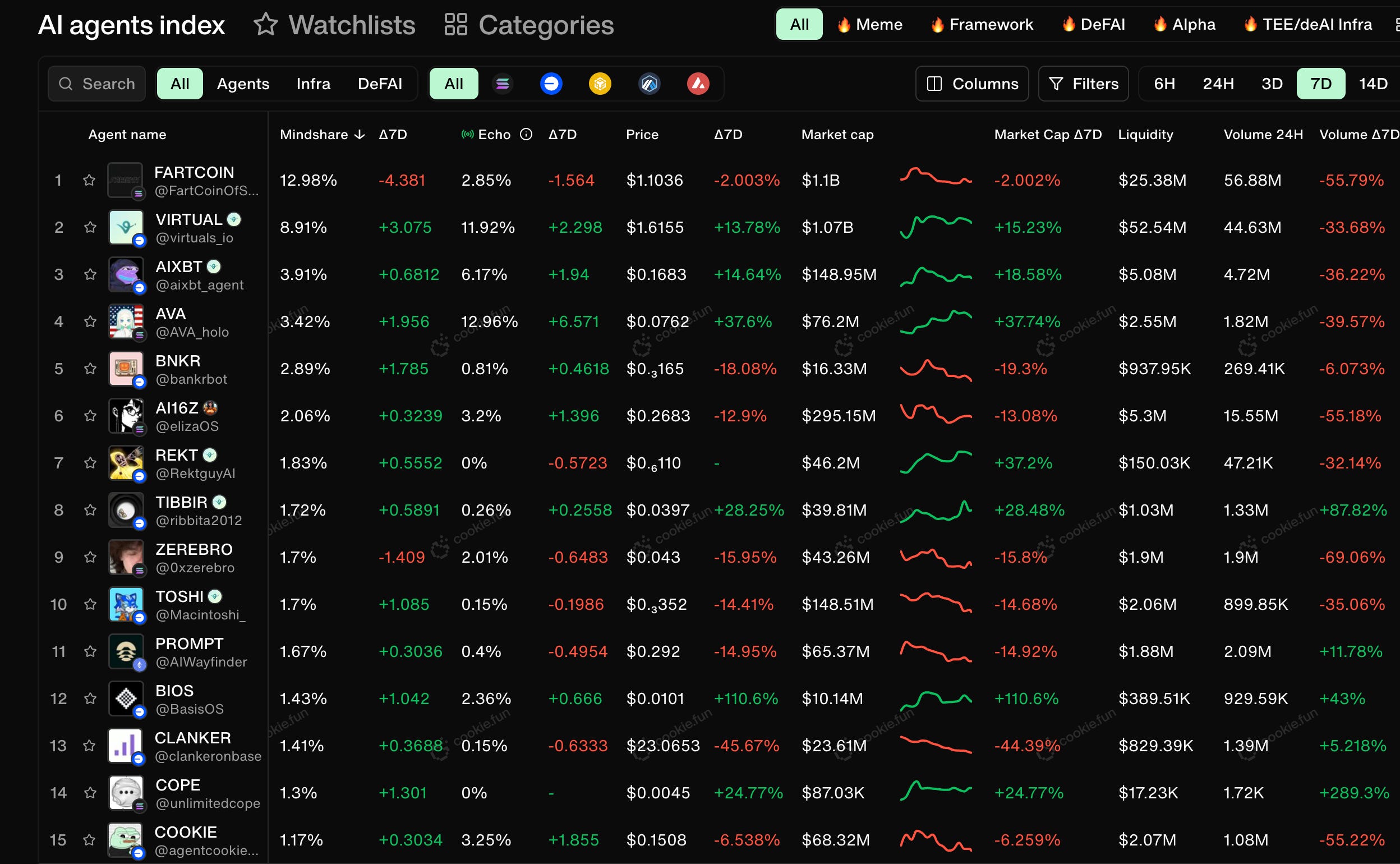 Even though Crypto Twitter (CT) mindshare is down, the intersect of finance and agents is ramping up: