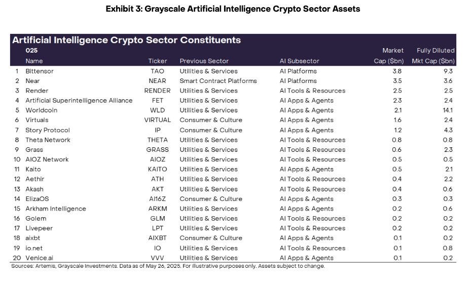 Many of these established AI tokens have been featured in the latest Grayscale AI snapshot report, published this week: