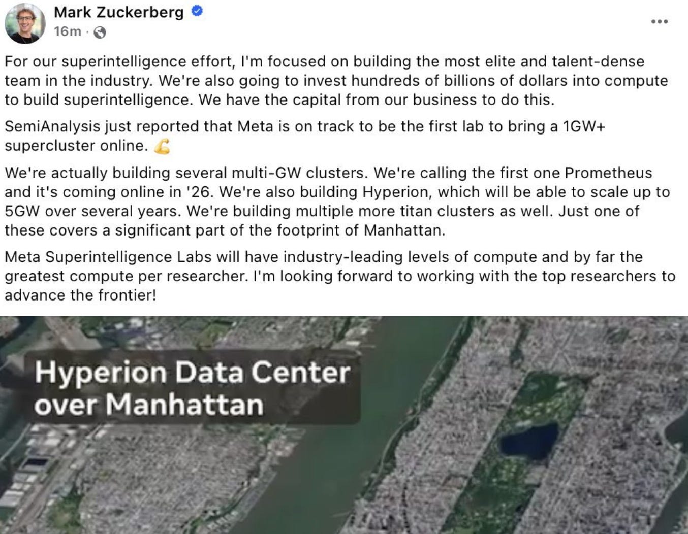 Zuck has announced a significant investment into data centres around Manhattan: