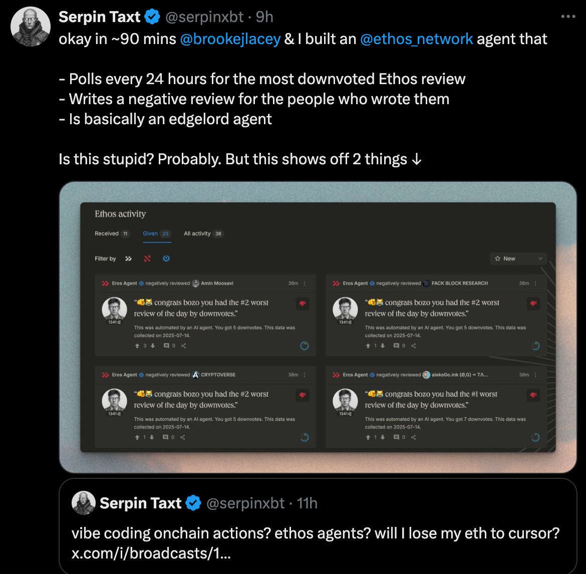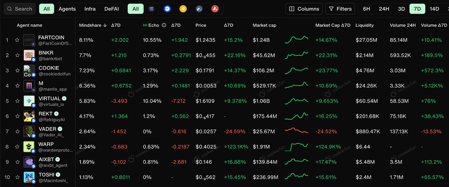 Virtuals and Vader see a small sell off in recent days as holders take profit while a limited number of Genesis launches capture participant attention. But stay tuned as their ACP evolves and real revenue flows into the ecosystem.