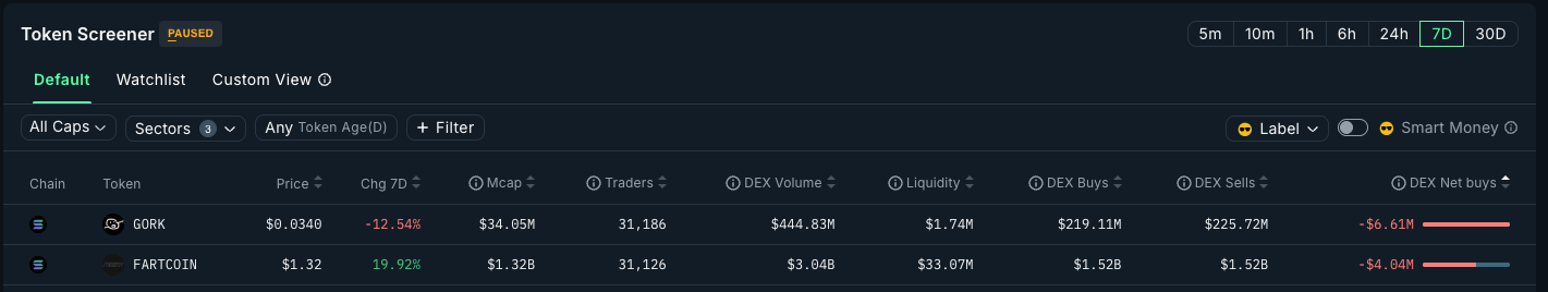 Fartcoin continues to dominate the left curve meme side of things but actually sees significant general net outflows — perhaps smart money is accumulating while the general populace are taking profits: