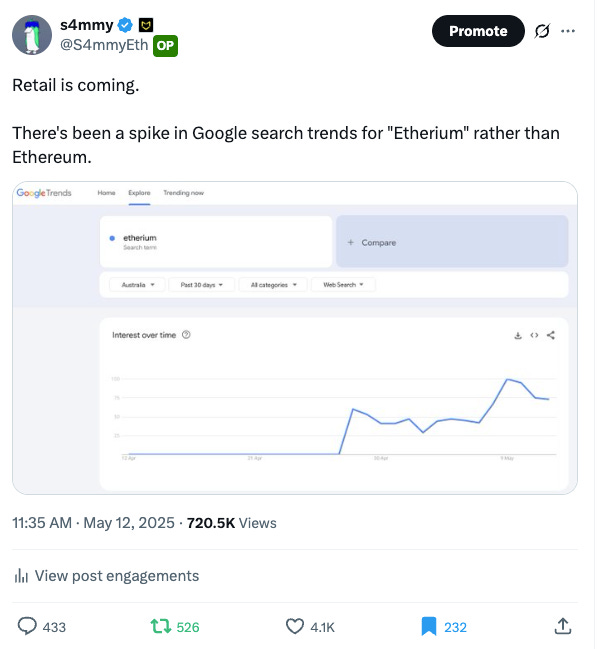 ETH shows signs of fresh retail investors searching the programmable money “Etherium” on Google: