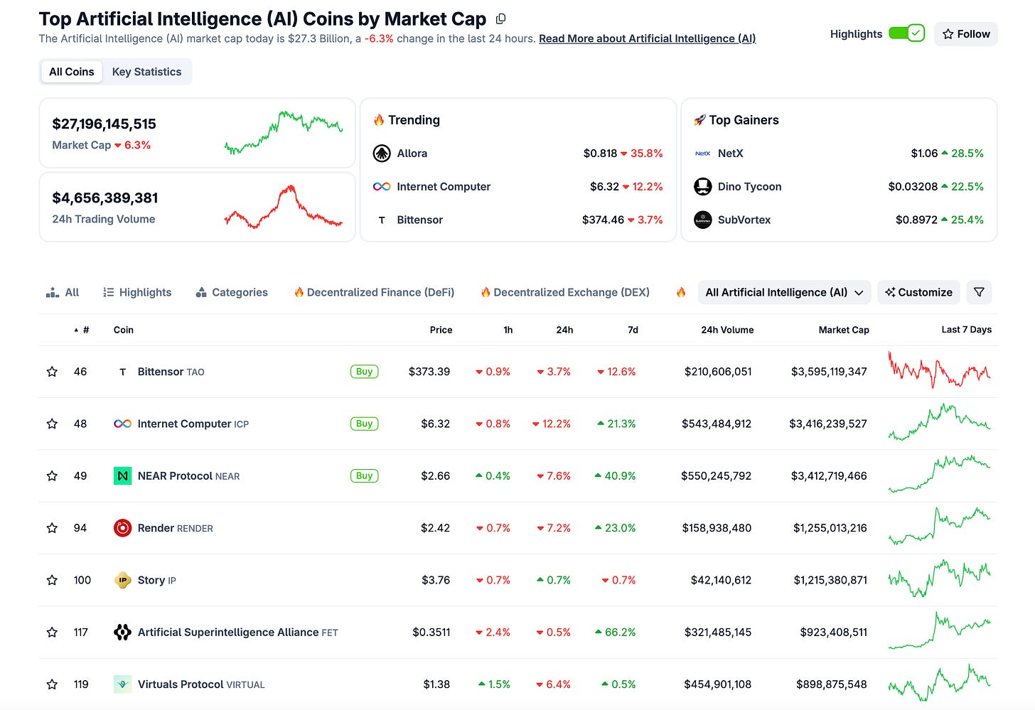 The overall DeAI market cap is up by $2.3bn (+9.3%) to $27.2bn: