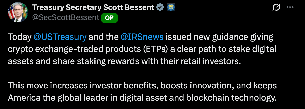 The US Treasury + IRS issued new guidance giving crypto exchange-traded products (ETPs) a clear path to stake digital assets:
