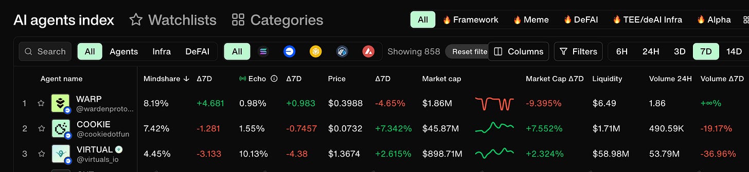 VIRTUAL: As noted above - mentions from Fundstrat + BitRobot announcement around Subnet 5 (SeeSaw) + several booming agents like FACY noticed outside of the crypto bubble